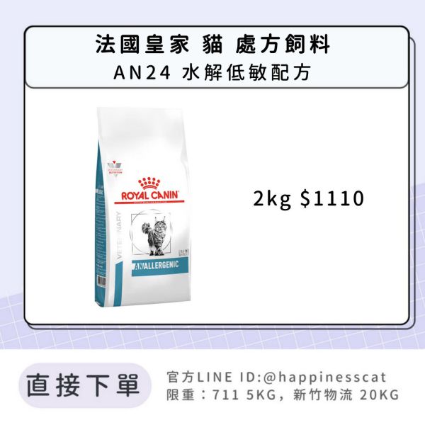商品詳情 處方食品,須依獸醫師指示下使用 🚚 寄送重量限制 超重麻煩請拆單下!! 寄送方式 限重 費用 7-11 取貨不付款/ 7-11取貨付款 5公斤 66元 新竹物流 20公斤 120元 法國皇家 處方飼料 貓 AN24 水解低敏配方 TWD $1,110 TWD $1,110