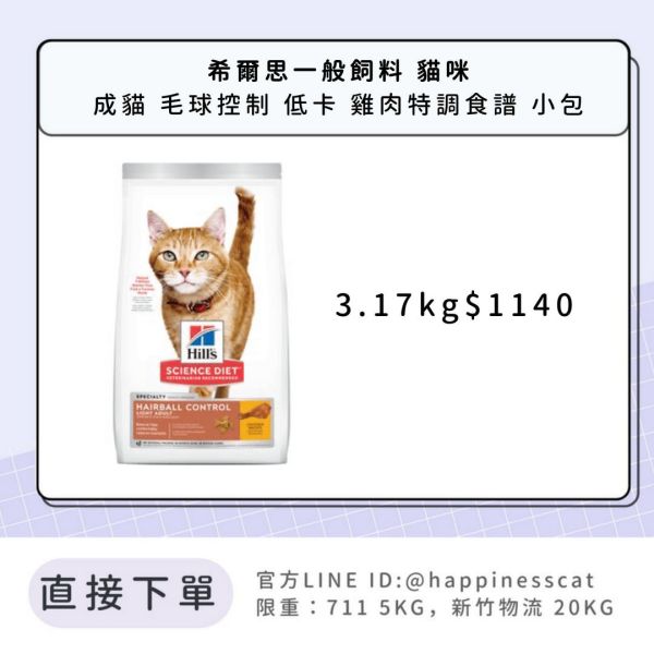 希爾思持續進行營養研究,了解天然纖維如何和緩清除貓咪體內毛球。 - 天然纖維和緩清除體內毛球 - 熱量相較於希爾思寵物食品成貓毛球控制配方減少 13% - 精實肌肉所需的優質蛋白質 - 營養配方有助避免貓咪體內毛球形成 ,同時有利於減重與健康生活