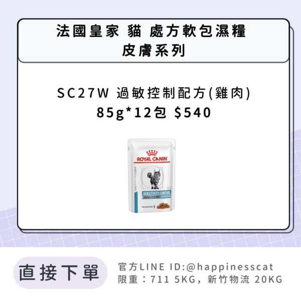 商品詳情 ✅ 本產品為特殊配方,請務必遵照獸醫師指示 處方食品請依獸醫師指示下使用。 🚚 寄送重量限制 超重麻煩請拆單下!! 法國皇家 貓 處方軟包濕糧 皮膚系列 SC27W 過敏控制配方(雞肉) TWD $55 ~ 590 TWD $55 ~ 590