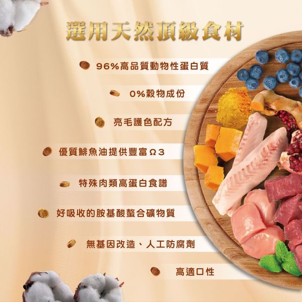 營養成分及含量:粗蛋白23%、粗脂肪18%、粗纖維2.9%、粗灰分7.9%、鈣0.9%、磷0.8%、Omega-3 2.30%、Omega-6 1.60%、EPA 0.7%、DHA 1%、葡萄糖胺 1200mg/kg;硫酸軟骨素 900mg/kg。