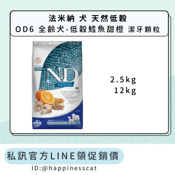 主成份:鱈魚(24%)、脫水鱈魚(24%)、鯡魚油、斯佩爾特小麥(10%)、燕麥(10%)、乾燥甜菜漿、豌豆纖維、乾燥胡蘿蔔、苜蓿粉、菊糖、果寡醣、甘露寡醣(萃取自酵母)、乾燥甜橙(0.5%)、乾燥蘋果、乾燥石榴、乾燥菠菜、洋車前子殼與種子(0.3%)、乾燥藍莓、氯化鈉、乾燥啤酒酵母、薑黃(0.2%)、蘆薈萃取物、葡萄糖胺、硫酸軟骨素。