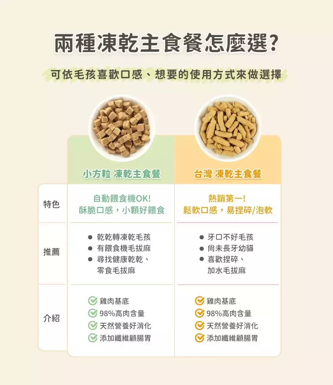 商品詳情 保持食材原始營養的天然乾主食! • 0%澱粉、植物性蛋白 • 可使用自動餵食機 • 無人工添加物,保留食材原始風味 產地:台灣 【汪喵星球】貓咪 凍乾主食 小方粒型 TWD $210 ~ 1,290 TWD $210 ~ 1,290
