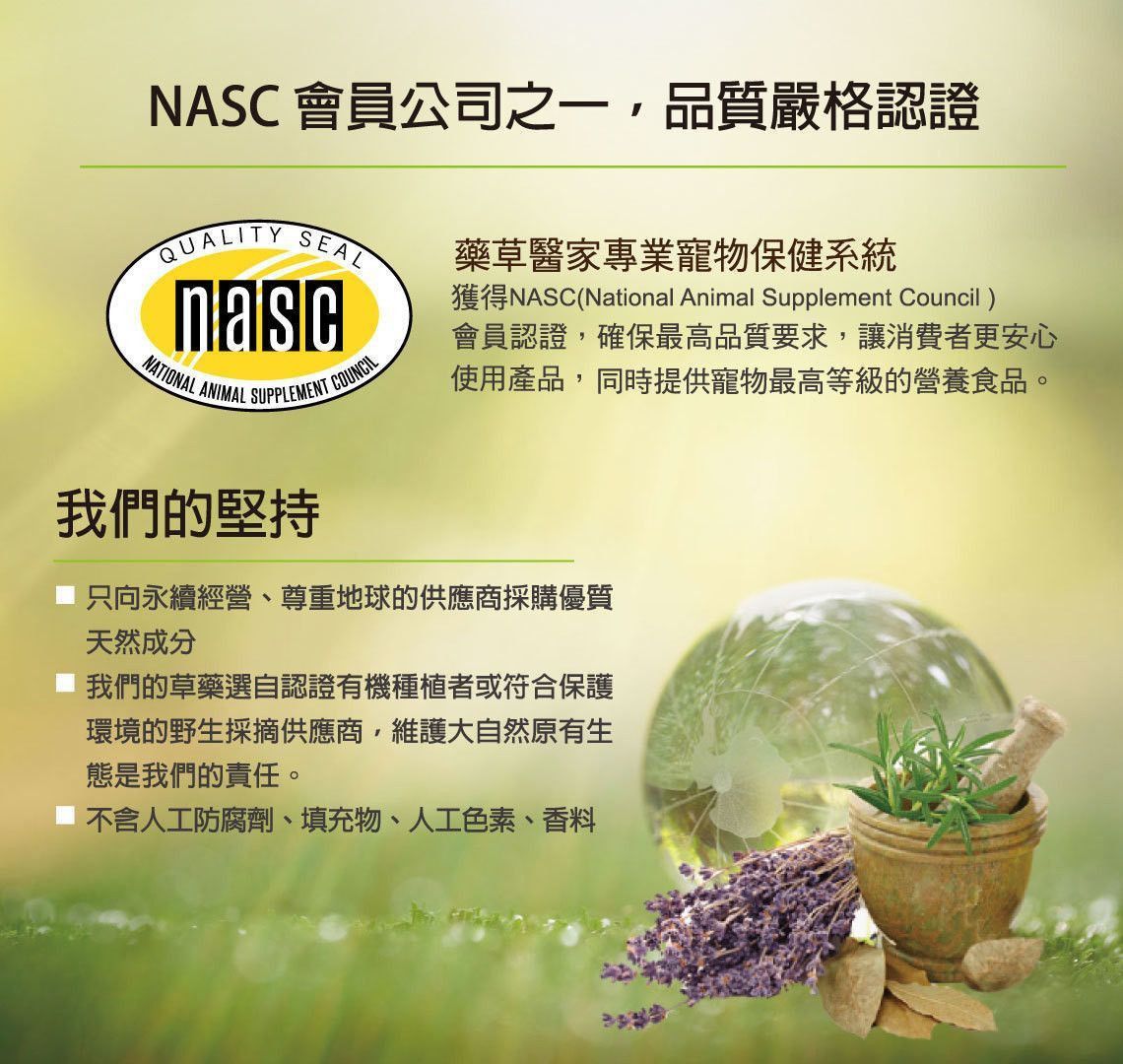 藥草醫家專業寵物保健系統獲得NASC(National Animal Supplement Council )會員認證,確保最高品質要求,讓消費者更安心使用產品,同時提供寵物最高等級的營養食品