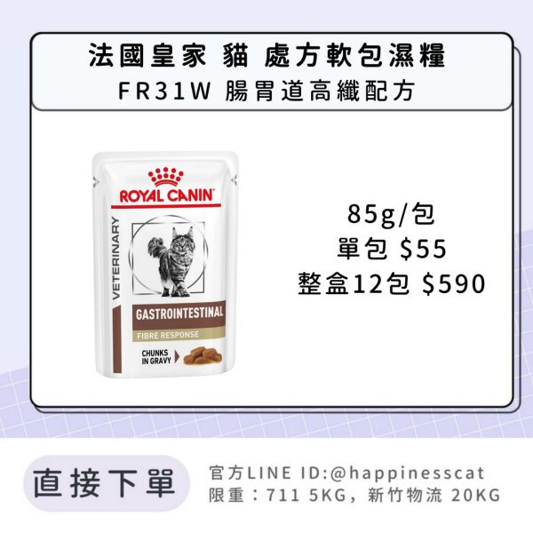 商品詳情 ✅ 本產品為特殊配方,請務必遵照獸醫師指示 處方食品請依獸醫師指示下使用。 🚚 寄送重量限制 超重麻煩請拆單下!! 法國皇家 貓 處方軟包濕糧罐頭 腸胃道系列 FR31W 腸胃道高纖配方 TWD $55 ~ 590 TWD $55 ~ 590