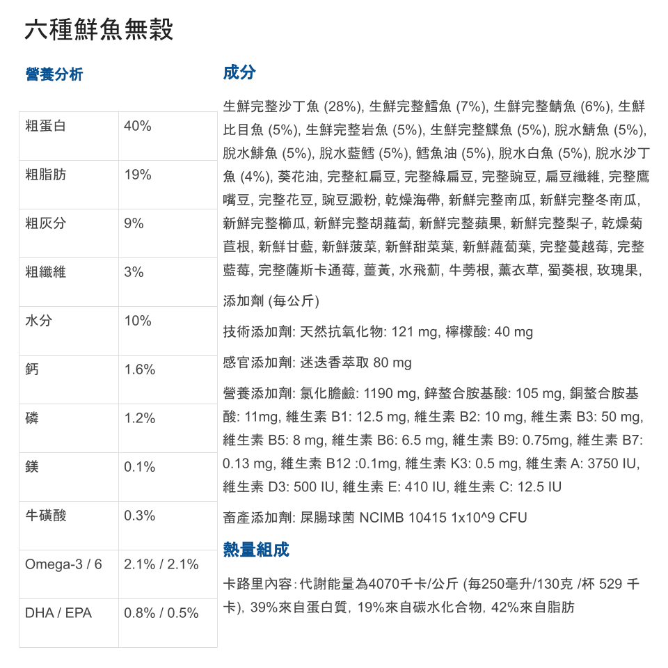 六種鮮魚無榖配方貓飼料【野生漁獲+新鮮蔬果】