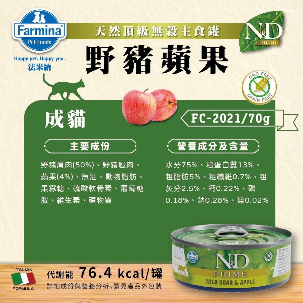 主要原料:野豬肩肉(50%)、野豬腿肉、蘋果(4%)、魚油、動物脂肪、果寡糖、硫酸軟骨素、葡萄糖胺、維生素、礦物質。