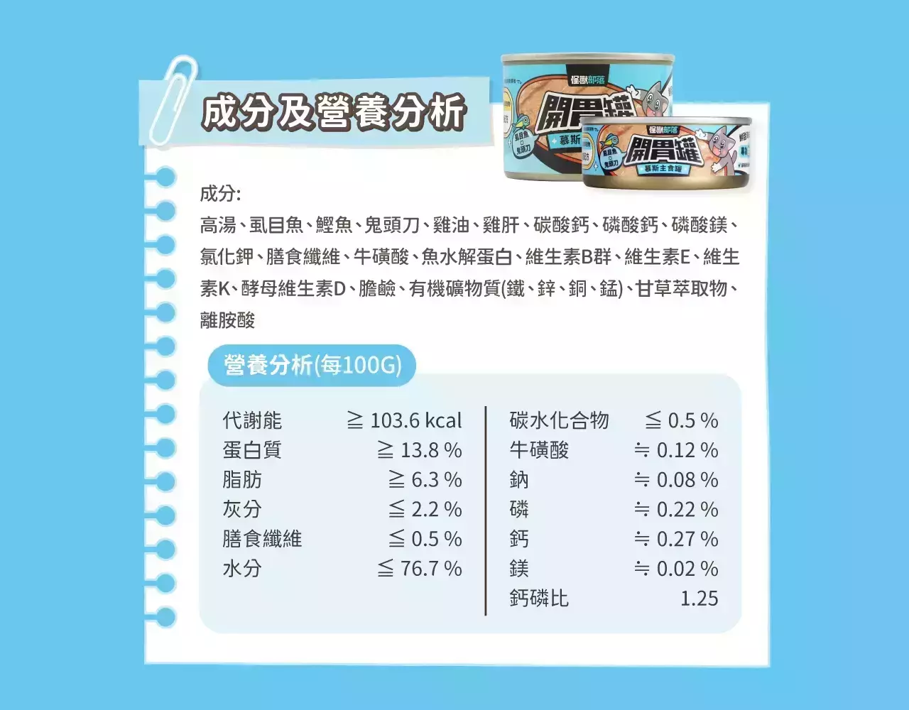 商品詳情 讓挑食貓天天敲碗,3秒清盤! 專為挑嘴貓設計 從質地配方到營養機能一罐解決! V 挑食貓 V 轉食貓 V 喜歡海味的貓 • 貓咪最愛-慕斯舔舔質地 • 好好吃!鮮甜海味雙拼+水解蛋白 • 好營養!維生素添加 • 好機能!泌尿x腸胃x呼吸道 【怪獸部落】貓咪 開胃慕斯主食罐 165G TWD $800 TWD $800
